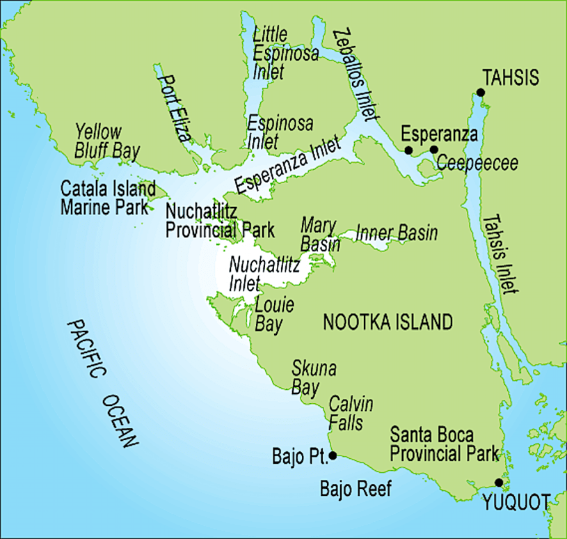 Nootka Island lies off Vancouver Island, to the west of Gold River, and spill response in such a remote, exposed area would be difficult. Although heavy surf would help clean up the oil naturally in exposed regions, a lot of semi-protected environments, created by small islands and reefs, would be affected. Birds and mammals, including marbled murrelets and sea otters, would be at risk. It’s an area with strong First Nations interests, which would also need to be respected.