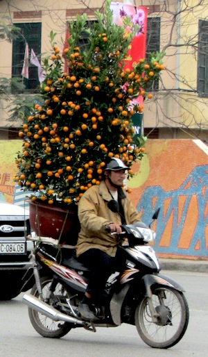 It’s just days before Tet and everyone in Hanoi is buying a kumquat tree for good luck in the coming Lunar New Year. Kumquats look like really cute baby mandarin orange trees, and according to one of my Vietnamese colleagues, it’s very important the tree has “good posture”. Not standing up straight, but a pretty shape.These trees are typically carried to their new homes by stern-looking motorbike drivers, miraculously balancing them on the backs of their bikes.