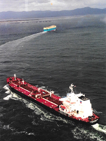Helicopter pilot Karl Hatlemark makes a turn so I can see the two vessels heading inbound more clearly. In the foreground is the tanker “Chevron Colorado”, and in the rear is the colorful car carrier “Maersk Taiki”.
